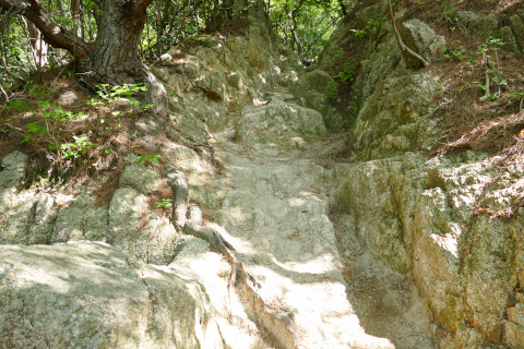 日陰が気持ちいい。中道は花崗岩が風化したざれた道で歩きにくい。でも、山野草があったり、展望