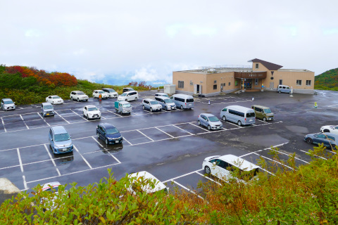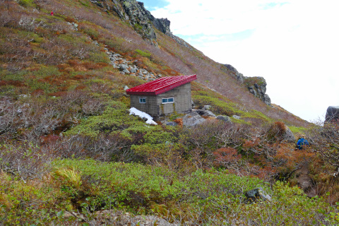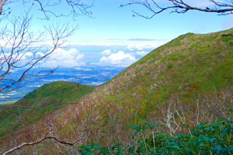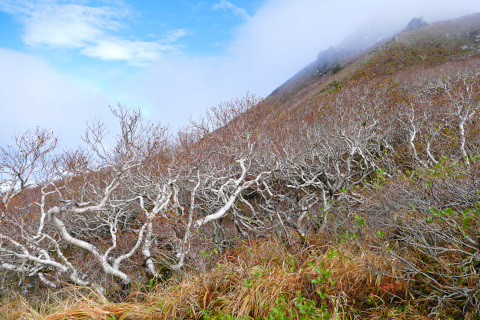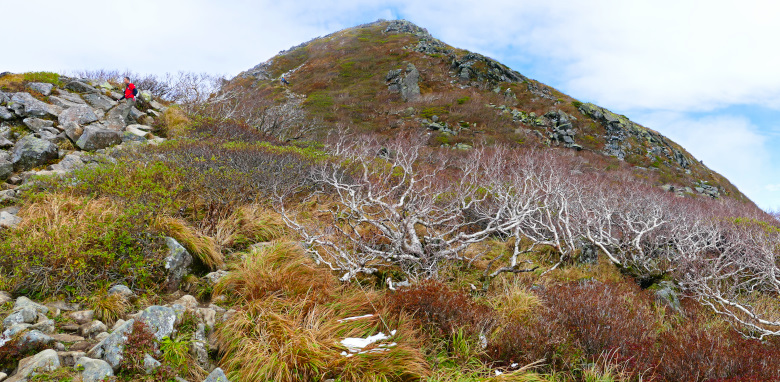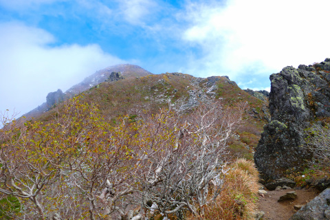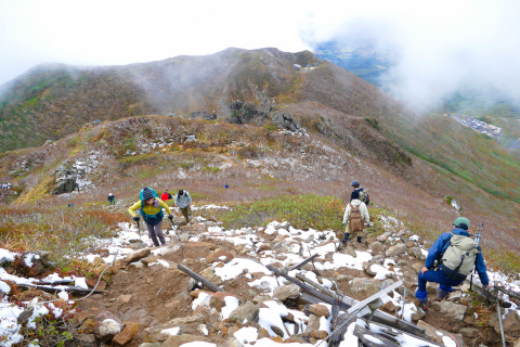 外は寒い。防寒の用意をしてスタートした。雲は多めだが徐々に展望がよくなってきて、 日本海が見えてきた。前山のガスも切れてきて黄色や赤の紅葉がきれいだ。前日の雨や雪 のせいか登山道は相当ぬかるんでいて歩きにくいが、傾斜はゆるやかだ。9合目までくると 火山の溶岩がゴロゴロしていて荒々しく、雪も残っているので寒々としている。山頂が見 えたが、風が出てきてガスも再びかかってしまった。残念ながら展望はなくなり白一色の 世界に変わってしまった。汗ばんだ体はじっとしていると冷えてくるのでランチをとって 早々に下山した・・・・・・・・・・・・・・・・・・・・・・・・・・・・・・・・・